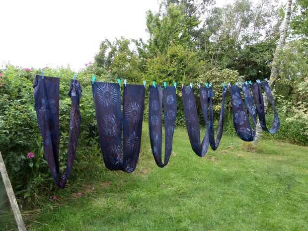 Cuelgan en una línea de lavado y ver que el color cambie de verde a azul, el añil oxida cuando sale el aire.