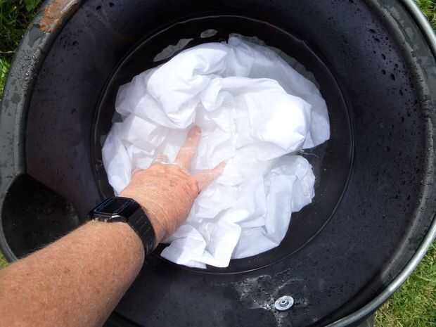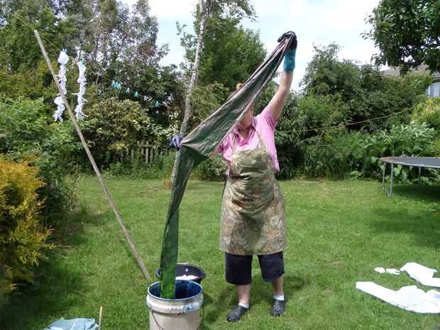 Es importante no dejar que la tela gire sobre sí mismo ya que esto puede hacer el teñido irregular, bastante difícil de hacer en un día ventoso! También no usar su mejor traje o zapatos, me puse bien splatted!
