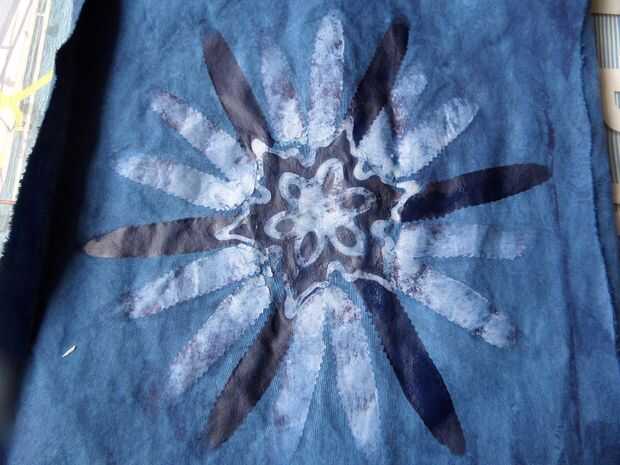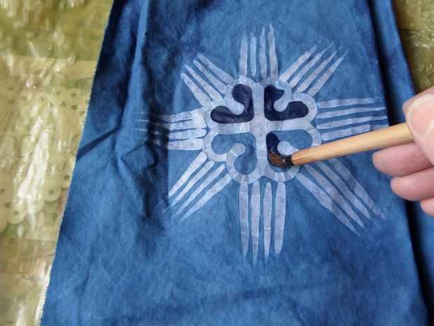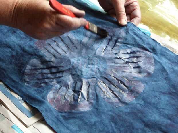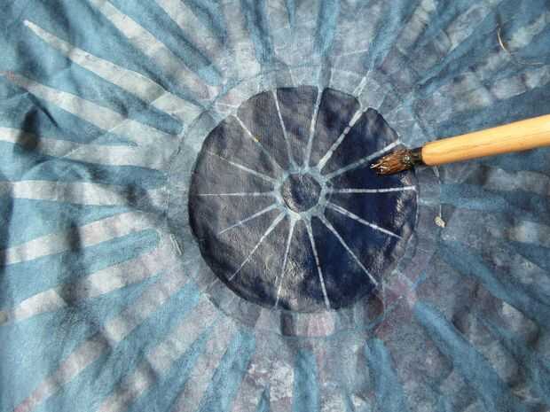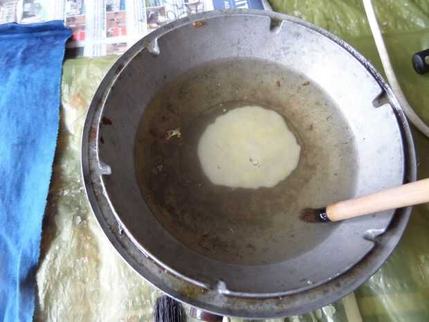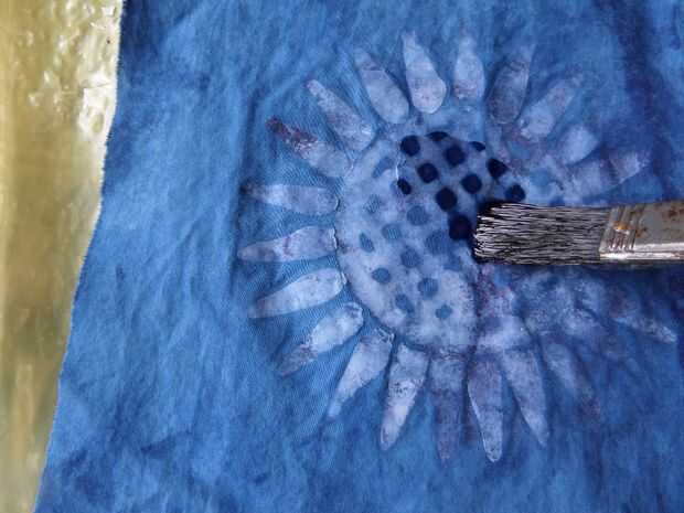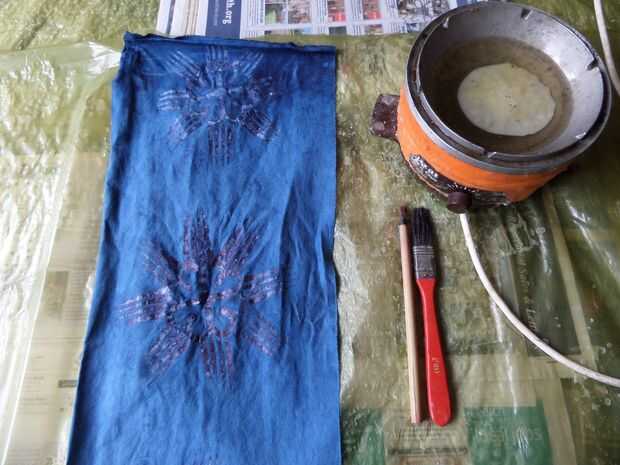 Después de secas las tiras de tela pensé que podría añadir algo a los diseños si rewaxed ciertas zonas para capturar esta etapa de azul. Las fotos me muestran aplicar cera con un pincel a los centros y los pétalos de cada diseño. Estoy usando una olla de cera diferentes como ésta es fácil para aplicar la cera con un pincel, pero estaría bien la cacerola plana.