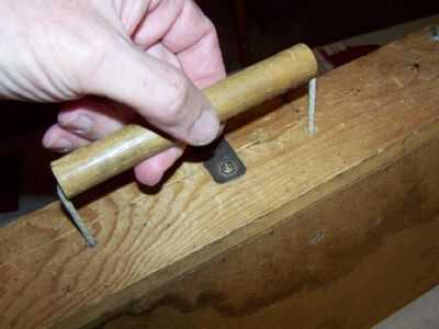 hice un mango muy simple de una barra de pasador. He perforado un orificio de extremo a extremo a través de su centro y había insertado algunos de cuerda de nylon de una cuerda de arranque cortacéspedes. El cable se desliza a través de orificios en el caso y es mantenido por un nudo en cada extremo. Para evitar trabajo los nudos sueltos o que, derrite una porción de cada nudo para fundirse en una masa. Un fósforo encendido o la punta de la pistola de soldadura funciona bien para esto. Mi mango es crudo, pero funciona.