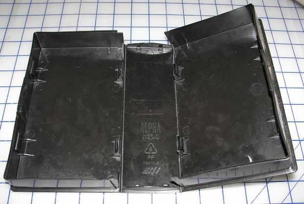 En la búsqueda de recipientes apropiados iniciar este proyecto, encontré una caja de doble caras cajas de cinta VHS. Estas cajas están diseñadas para contener 2 cintas VHS. Desde cintas VHS están volviendo menos populares, estas cajas son fáciles de encontrar. Una biblioteca local fue tirar las cajas y también he visto varios de estos en tiendas de segunda mano locales, a menudo con cintas en ellos, por $1 o menos. Estas cajas de abrirán y en posición plana. Las cajas también tienen pinzas en cada lado para mantener las cintas en cuando se abre el caso.