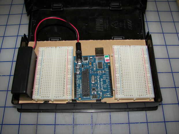 Seco los elementos muestra que hay un montón de espacio para encajar breadboards 270 punto dos en el caso. Me gustaria tener un protoboard a cada lado del Arduino, esto hace que el diseño de muchos proyectos mucho más aseada. Marque la ubicación de los 2 orificios de montaje en el Arduino.
