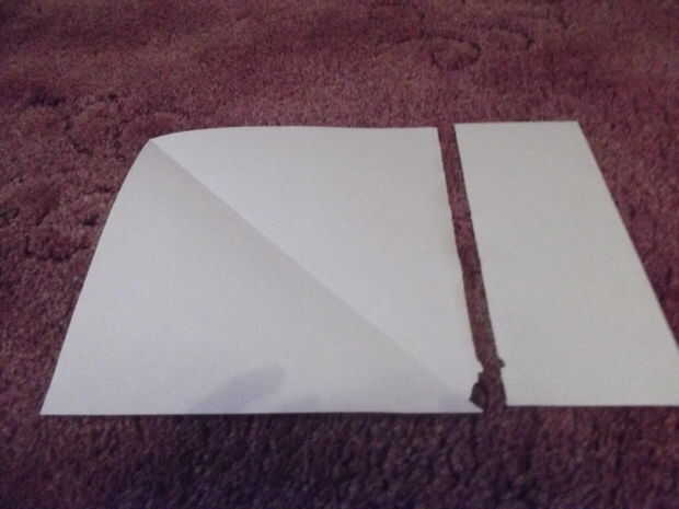 Tomar el papel de A4 y dobla una esquina hasta el borde opuesto (esta imagen es una ilusión, la parte de la derecha se supone para ser rectángulo) luego corte el sobrante (no tirarla, esta es la parte que necesita!)