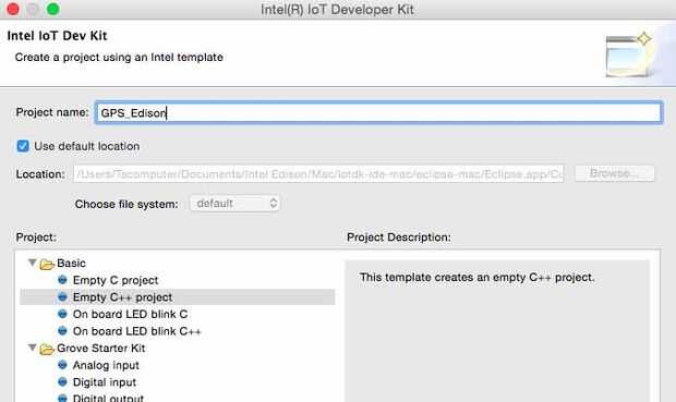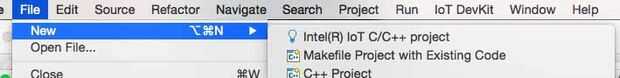 1. Inicie su Eclipse C++ y vaya a "archivo > Nuevo > proyecto Intel IoT C/C++" 2. Introduzca un nombre para su proyecto (nota no se permiten espacios).