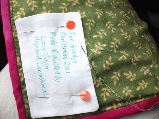 Pulse la etiqueta otra vez con un cálido a hierro caliente (Asegúrese de que tiene la muselina de algodón junto a la plancha) para fijar la tinta y luego cosen la etiqueta a la colcha.