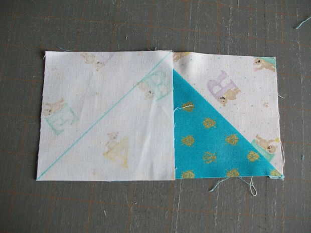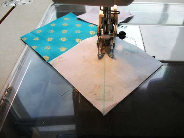 Coloque el rectángulo de ganso con el lado derecho de la tela hacia arriba y poner un cuadrado de cielo en la parte superior derecha hacia abajo, empareja los bordes cortados, con la línea dibujada, ir a una esquina como se muestra. Prender si se desea (generalmente no pin para costuras cortas) y luego usar su máquina de coser para coser a lo largo de la línea dibujada. Cosa desde el lado largo del rectángulo hasta la esquina, esto detiene la máquina de coser "comiendo" la broca puntiaguda.