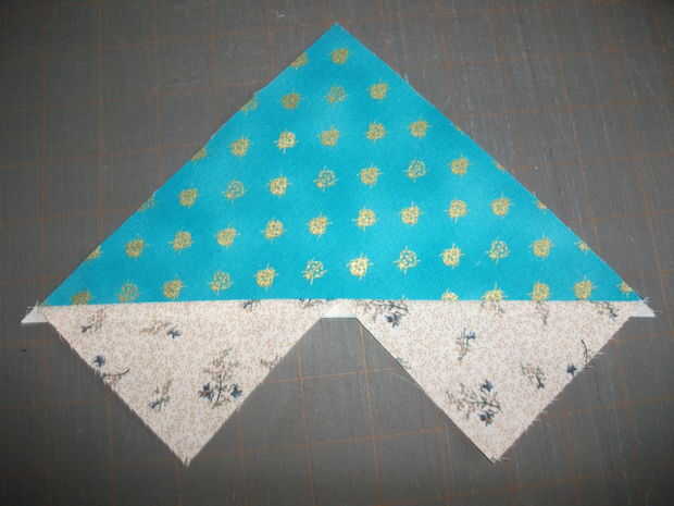 Con la Oca cuadrado derecha arriba, Coloque 2 cielo plazas derecha hacia abajo a lo largo de la diagonal como se muestra, empareja las esquinas y los bordes de corte. Coser 1/4" a cada lado de la línea central o líneas de costura tanto , dependiendo de cómo ha marcado sus plazas. Pulse las costuras y corte a lo largo de la diagonal entre las líneas cosidas como se muestra continuación, pulse sus triángulos cielo lejos de su triángulo de ganso.