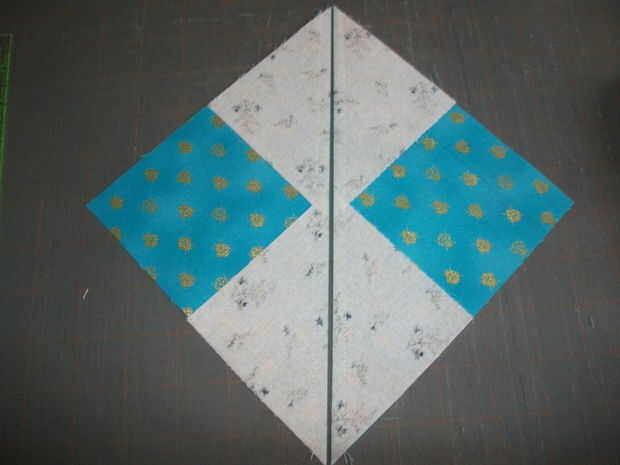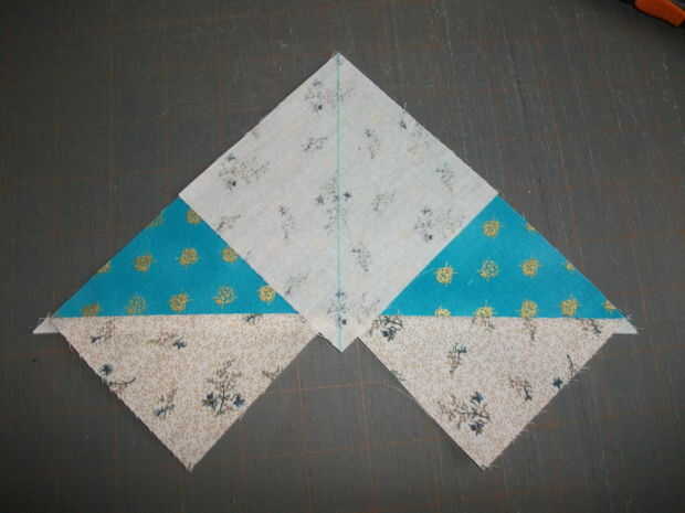 Lugar su próxima Plaza en el triángulo Oca, coincidencia de la esquina y los bordes como antes y coser otra vez 2 líneas paralelas de puntadas 1/4" de la diagonal. Después de coser ambas líneas de costura Pulse las costuras y luego, otra vez, cortan a lo largo de la diagonal entre las líneas de costura. Presione el segundo triángulo de cielo del ganso y recortar las dog-ears. Repita para cada pedazo hasta que tenga 4 gansos voladores.