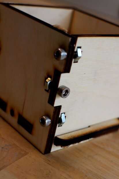 Las articulaciones anteriores funcionará bien con algun pegamento alrededor de los bordes, pero no puede hacer tan un sello permanente en sus piezas. Creando un agujero para un perno de diapositiva a través y una ranura para una tuerca que prensa encaja, puede asegurar los empalmes de láser cortar piezas fácilmente.