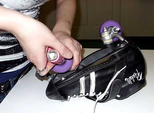 • Repita con las otras ruedas del siete hasta que todos ellos estén apretados a los patines para que no haga rodar. Una vez que las ruedas estén todos igualmente apretadas, podrás aflojarlos uniformemente según su preferencia.