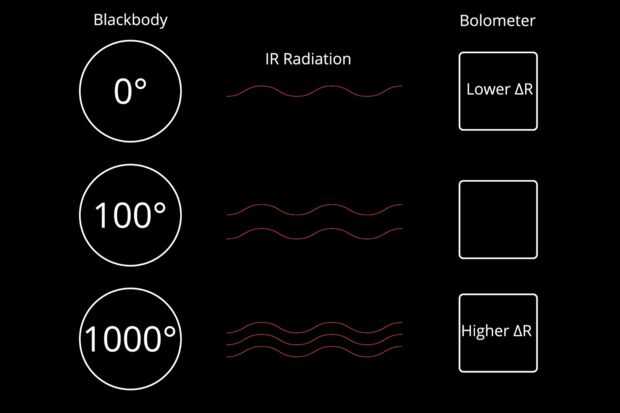 En un sentido básico, un bolómetro es un simple sensor que absorbe la radiación térmica y resistencia a los cambios como resultado. Este cambio en la resistencia puede medirse eléctricamente, y se puede determinar la radiación incidente (que debe ser una función de la temperatura del objeto). Un bolómetro es una cosa grande, así que en este caso, la matriz de pequeños sensores en las cámaras son microbolometers.