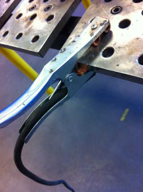 La pinza de masa es necesaria y puede fijarse a cualquier superficie de metal que puede proporcionar un campo adecuado.  En este caso, se utiliza la tabla de configuración de soldadura.