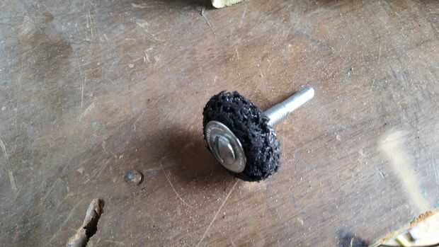 A continuación tomé una rueda de metal limpieza, empezar con fue un nuevo uno y cerca de cuatro pulgadas pero cuando terminé estaba desgastado y ya no tenía ningún uso. Usé un taladro para que pudiera entrar como limpié abajo de los tanques. En este punto fue el único costo real implicado y fue alrededor de dos dólares, pero vale para limpiar las superficies y los bordes de la caja fuerte.