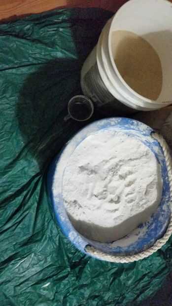 La ración de mezcla utiliza se basa en un cincuenta cincuenta igual mezcla de arena y yeso combinado con suficiente agua para que sea una mezcla de slop y luego he añadido dos tazas de arcilla de la bentonita en el final. No era necesario añadir la arcilla pero pensé que lo tenía así que algunos utilizaría a firma para arriba.