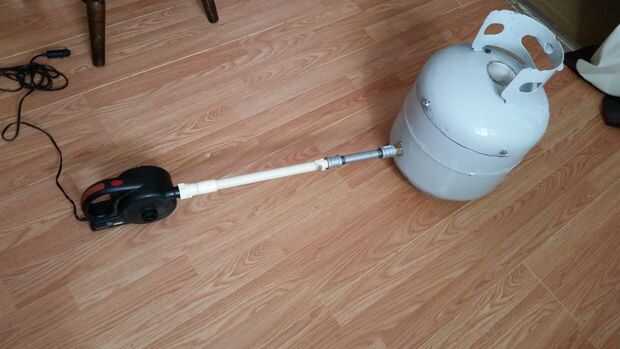 Así que utilicé un ventilador cama que tenía en el cobertizo. La fuerza era decente y estable así que hice un sistema de conexión de tuberías para él.