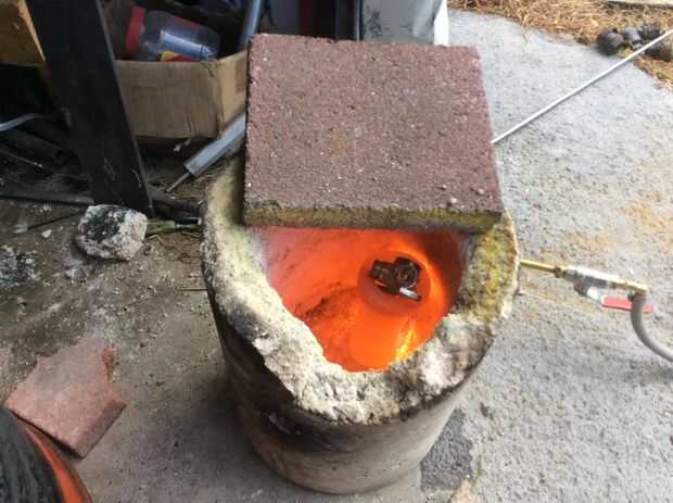 Mi primer metal fusión experiencia fue con una fundición de carbón. Fue creado con un cubo de acero inoxidable de 20 litros en el exterior y un cubo de 4 litros en el interior, una pipa de vino por el lado del cubo y fue conectada a un aspirador de golpe. El espacio entre los 2 cubos se llenó con hormigón normal y mientras fundir metal también arrojó pequeñas brasas una vez que quemó un poco.