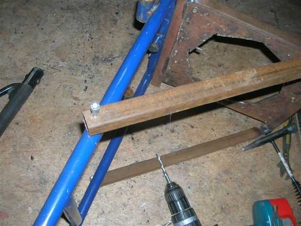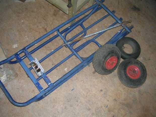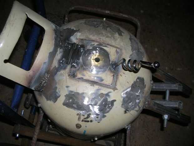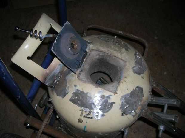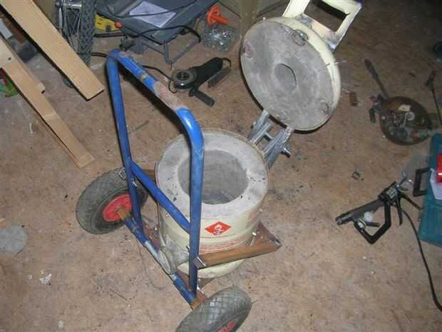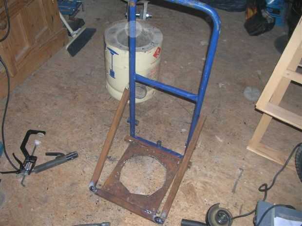 La fundición estaba lista para la acción en este momento pero encontré moverla bastante tarea con refractarios que pesado. Así soldó con autógena asas de refuerzo de 5mm que tomé desde mi primer horno rota la tapa. Después de eso hice un carrito pequeño para el horno hecho de chatarra de una carretilla de la mano con 2 ruedas buena que encontré en un salto de basura. Para cerrar el orificio de salida soldó con autógena el metal que cortar desde la parte superior del cilindro a una bisagra y es parte de un gancho de baño como un mango.