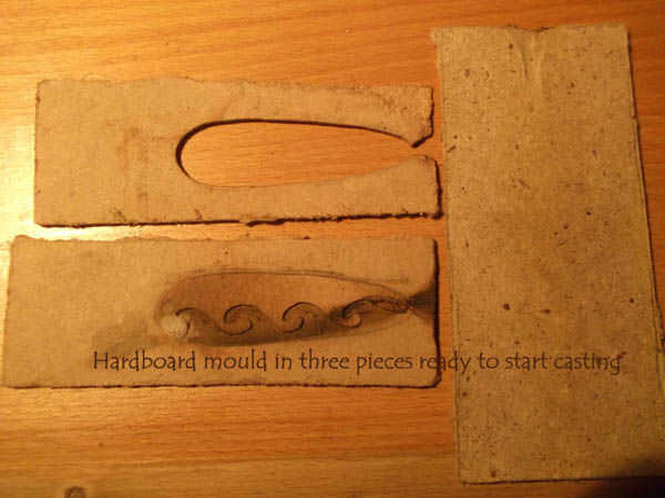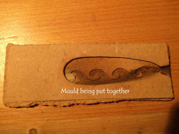 Coloque la primera tabla en la siguiente junta traza en torno a la forma ovalada, a continuación dibujar las ondas dentro de esta forma ovalada en la placa, cortar las olas con las sierras de marquetería y papel de lija ligeramente. Fina hacia abajo las olas con papel de lija para que queden unos 2mm de espesor, uso pegamento para madera para fijar las formas de onda a una pieza del tablero como en la foto. Así que lo que tienes es un molde de tres partes, una forma ovalada cae sobre la forma de onda y luego un plano detrás. Cortar una forma de v en la parte superior del óvalo como en la foto y el archivo una ranura en el tablero trasero con una lima redonda, esto es para verter estaño en cuando el molde se coloca juntos. Asegúrese de que el lado liso de la madera prensada cara no el lado áspero.