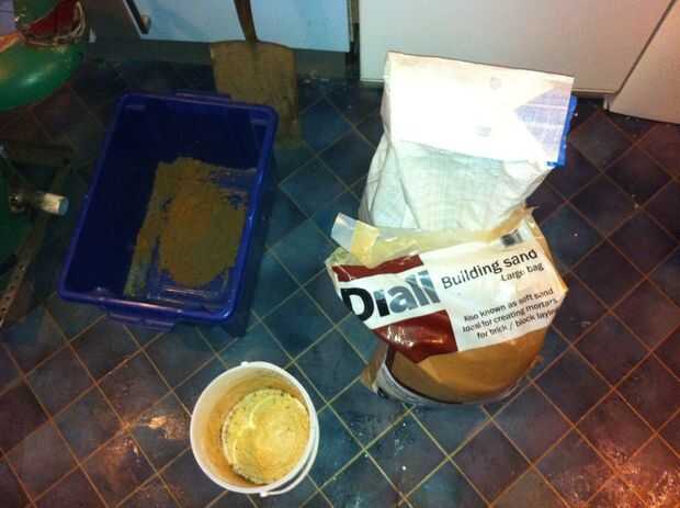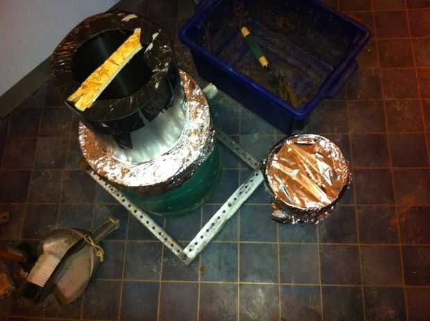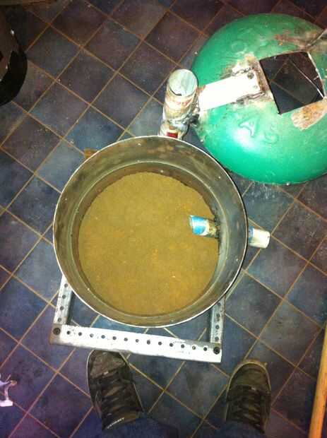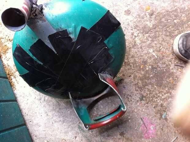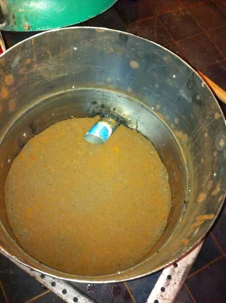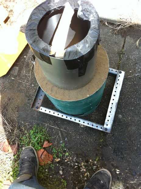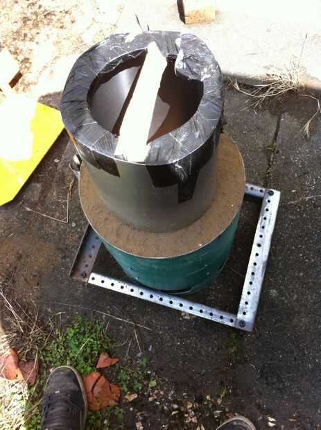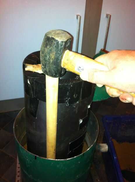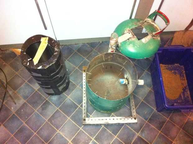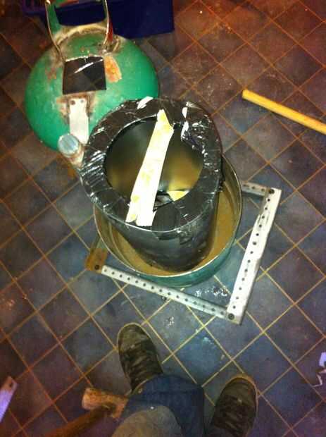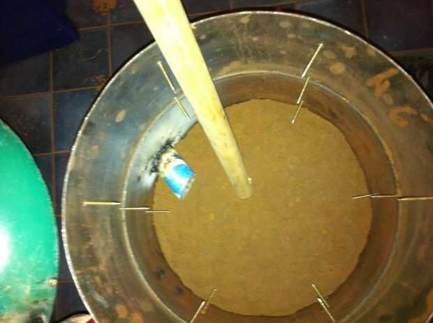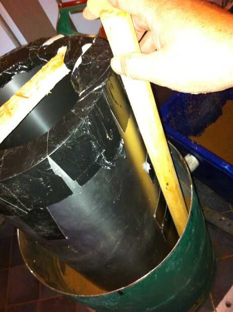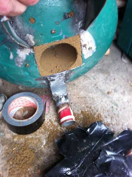 pala de la mezcla en la parte inferior de la botella de gas y ram hacia abajo con un pedazo de madera, necesitará cerciorarse de ram este muy duro y conseguir que todo el aire que usted puede. Tienes que hacer esto hasta que la parte inferior es el nivel de la parte inferior de la tubería de entrada de aire y bastante nivel.
