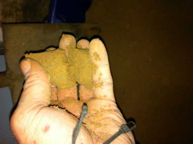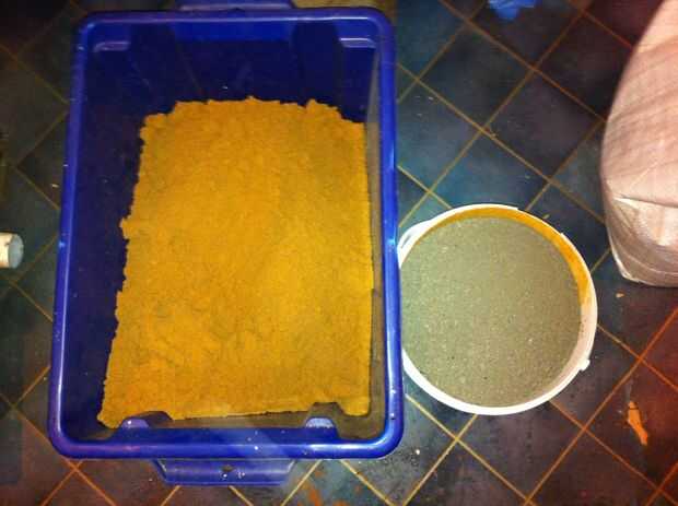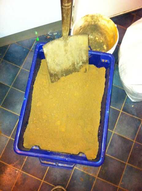 Usando un cubo pequeño mida sus ingredientes a un recipiente de mezcla y mezclarlos juntos, tu con el objetivo de la arena y la arcilla a agruparse cuando aprieta, pero no ser húmedo o pegajoso, no debe pegarse en la mano y se deberían romper limpiamente.