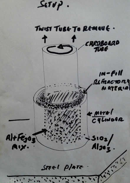 Tomar su barco acero / puede - línea con alrededor de 15mm de óxido de aluminio o arena. Usando un tubo de cartón como un papel de tejido Coloque en el centro de la lata. Un espacio de (15mm) debe ser observado fuera del tubo de cartón. Ahora relleno esta brecha con material refractario. Sujetando el tubo de llenado con la mezcla de hierro y suavemente Apisone. Tanto mezcla refractaria y hierro debe ser nivel - no importa si la mezcla de hierro es menor.