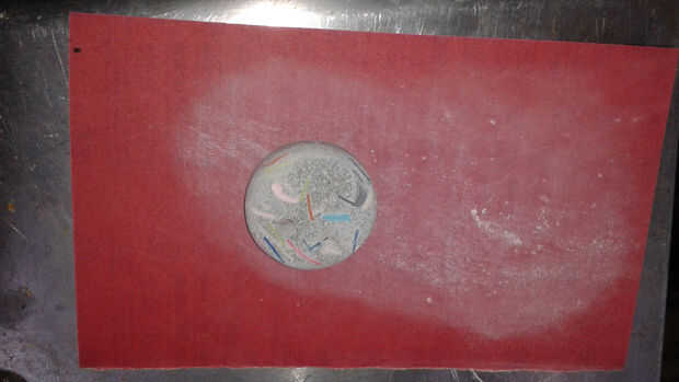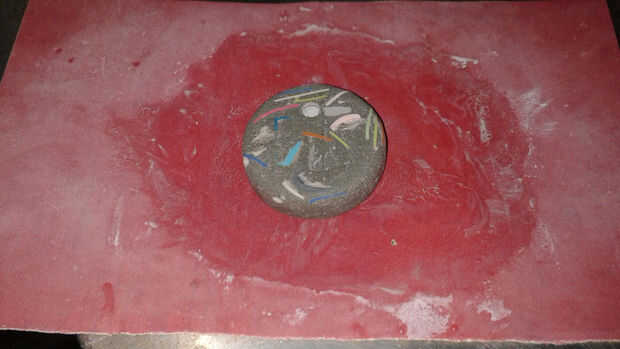 La segunda pieza fue mejor y terminé con un liso 1 1/2 "x 1/3" disco con manchas de colores y burbujas de aire menores. Mi mano la arena de aquí en adelante con 100, 220 y 440 grano lijas. Finalmente mojada la lija en suaves círculos construyendo una pasta de polvo de cemento que actúa como un abrasivo más para suavizar el pendiente. Cuando estaba satisfecho con la textura-liso superficial bastante cómodo pero áspero bastante interesante-i lavado y déjalo secar completamente delante de un ventilador.