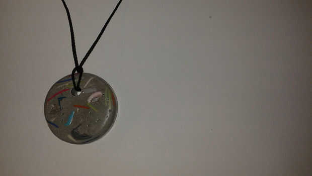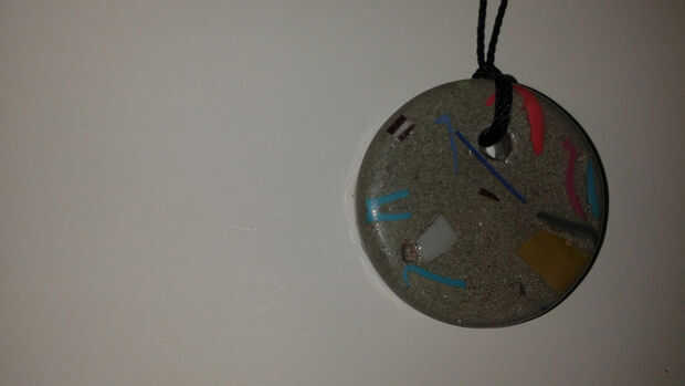 I el colgante a una paja de longitud completa de rosca y había suspendido entre dos latas de pintura en aerosol. Le di varias capas de esmalte transparente spray para darle un acabado liso y brillante. Cuando se seca había anuda en una longitud de cuerda negra. Ta da-un colgante concreto fundido con inclusiones de plástico reciclados.