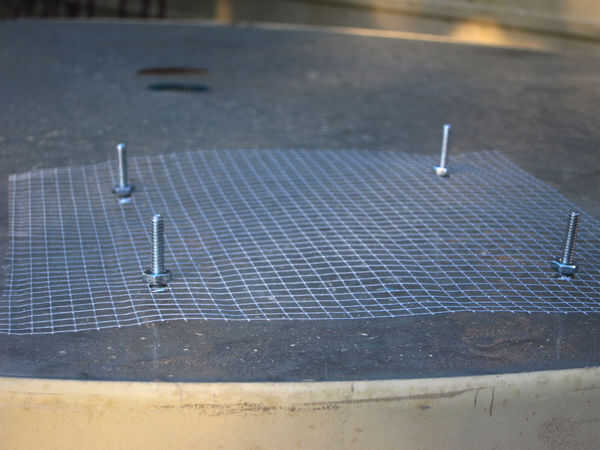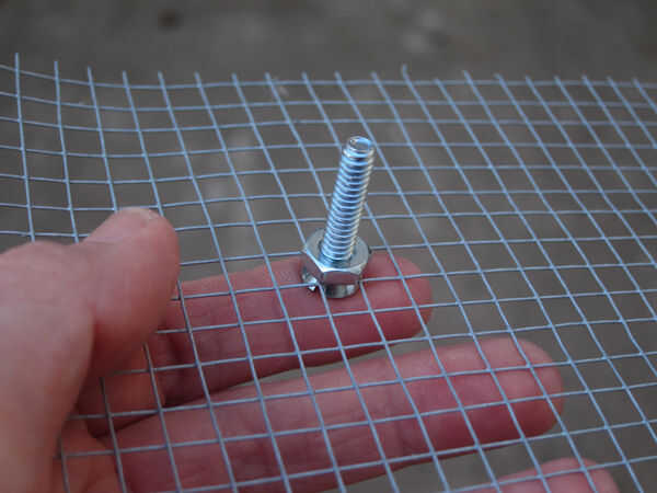 Para proporcionar un medio para colgar, atribuyo a tornillos de máquina, manteniéndolos en su lugar con las tuercas, en cuatro puntos de la malla. Coloque unos 2" en desde las esquinas.