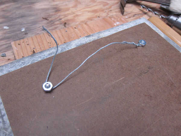 Cortar un trozo de trenzado imagen colgante de alambre de unos 3" más largo que la distancia entre los dos tornillos superiores. Cada uno desenroscar ligeramente y deslice el cable entre la tuerca y el masonite, atornillar la tuerca hasta mantener el alambre en su lugar. Tuerza los extremos sueltos del cable en el resto. Voilá, ahora usted puede colgar tu obra de arte.
