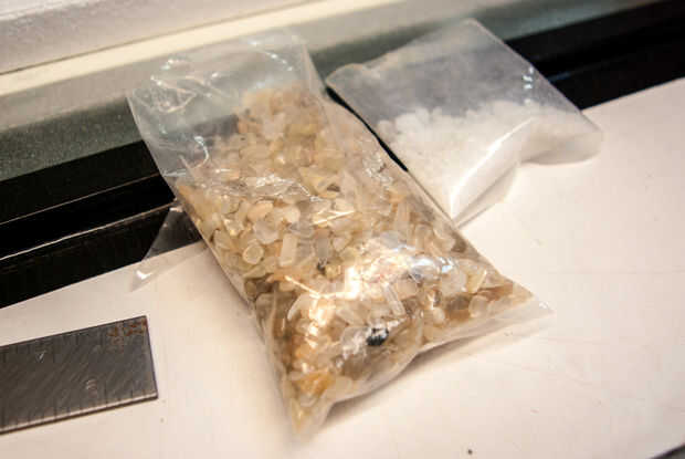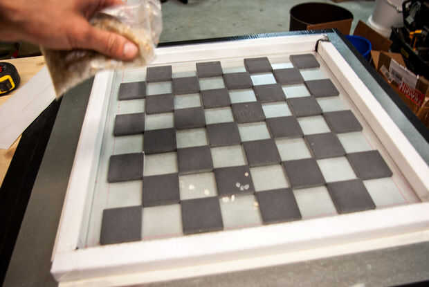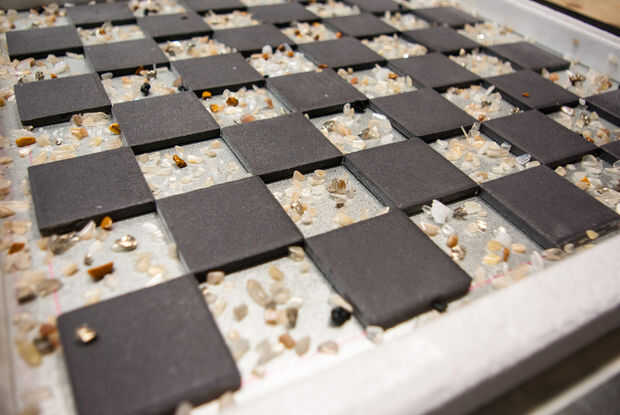 Esparcimos decorativo agregado (piedra lunar) en el formulario. Esto se mostrará en la superficie cuando se pule la pieza.
