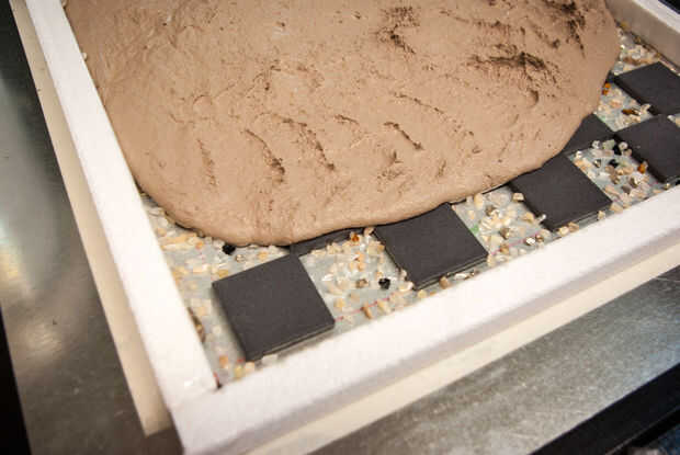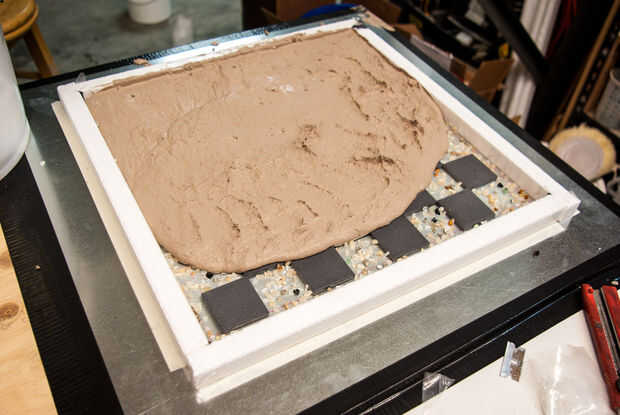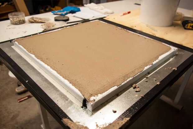 Vibrar la forma moviéndolo de lado a lado y levantando un borde y caer a la mesa. ShapeCrete no necesita una gran cantidad de vibración para conseguir una superficie muy estrecha, pero el agregado decorativo puede atrapar mucho aire.