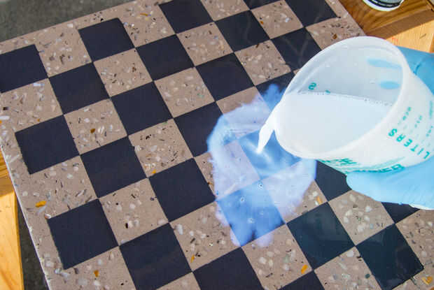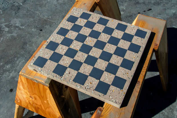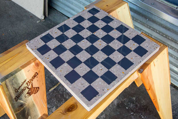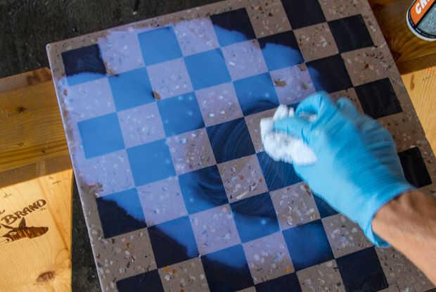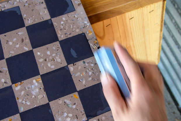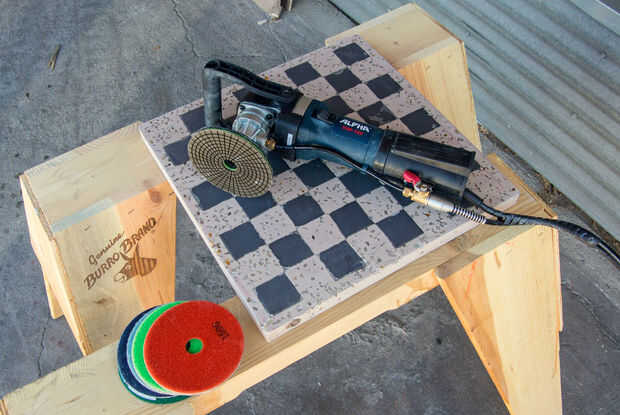 La pieza ahora se pule con una pulidora concreto de velocidad variable para exponer los áridos decorativos. Al igual que papel de lija, trabajas hasta un alto brillo con varios granos / cojines.