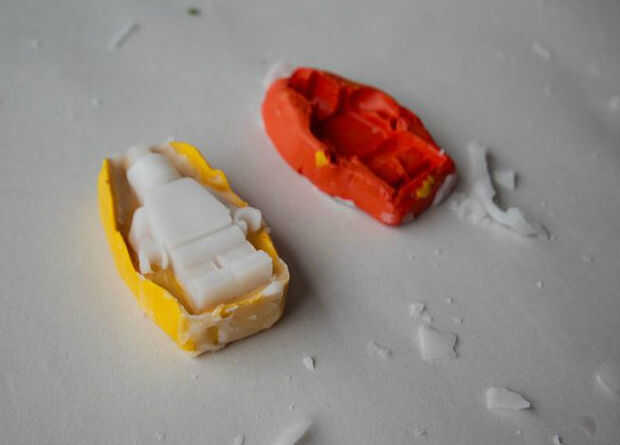 - Sugru primero se utilizará para hacer 2 mitades de un molde. Esto lanzará una cera 'copia' de su objeto. (Nota: sólo puede detener aquí con un molde de cera de una figura de Lego - incluso podría hacerlo en una vela como lo hice!)