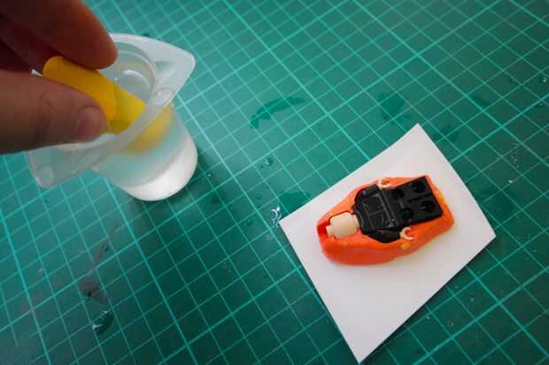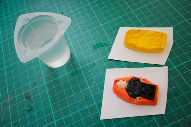 3. Humedecer la figura de Lego y el molde (una naranja).