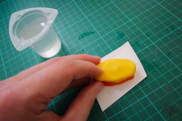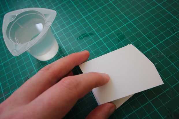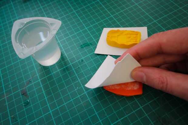 6. El Sugru pegaremos el papel más que el Lego/molde - tire así que el segundo (amarillo) media distancia cuidadosamente.