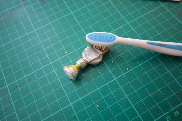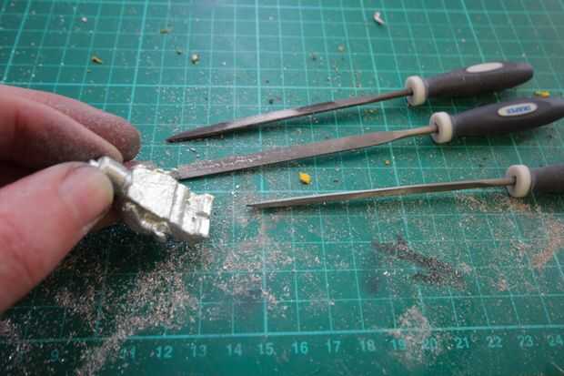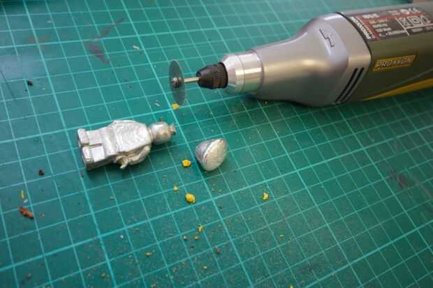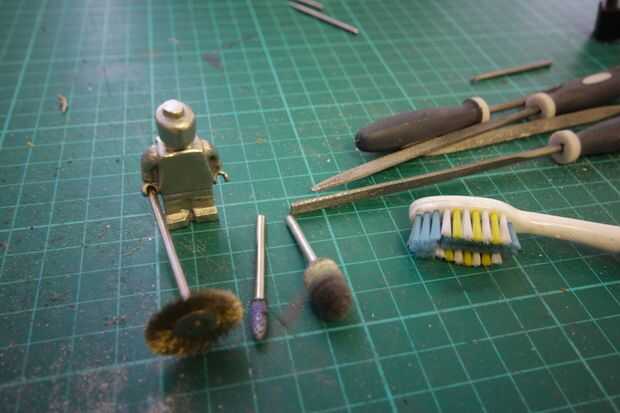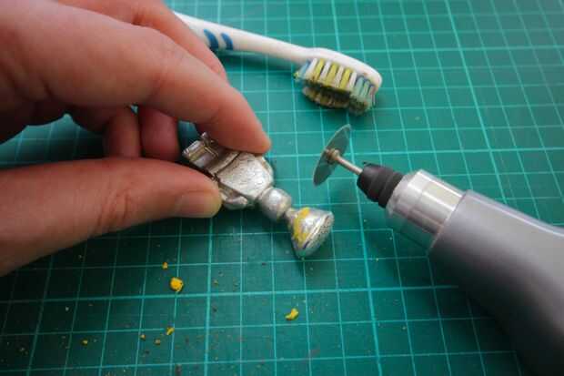 Hay numerosas maneras uno podía limpiar un molde de estaño, pero he encontrado que las pequeñas cantidades de Sugru residual con un cepillo de limpieza fue un buen comienzo. Entonces cortó el 'embudo' con una herramienta giratoria - tenga cuidado, se puso si se corta durante mucho tiempo. Asegúrese de cortar con algún 'exceso' - como que no quiere perder ese famoso 'golpe' en cabeza de la figura de lego! Luego archivé y pulido de la figura con una variedad de herramientas - la mayoría de los que vienen con la herramienta rotatoria.