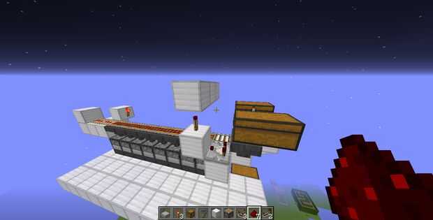 Ahora un compareter corriendo fuera de la tolva en un bloque con una antorcha de redstone, y luego poner un bloque ontop de la antorcha y añadirle 2 bloques como se muestra.