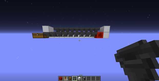 Reemplazar el bloque que se encuentran bajo los carriles aceptar que en el bloque de redstone con tolvas hacia lejos de la redstoneblock. Luego coloque nuevamente los rieles y coloque un bloque al final. Entonces puso un gran cofre en el extremo izquierdo y conectar las tolvas a él. Por último colocar tolvas hacia el carril pero no el riel en el bloque de redstoe.