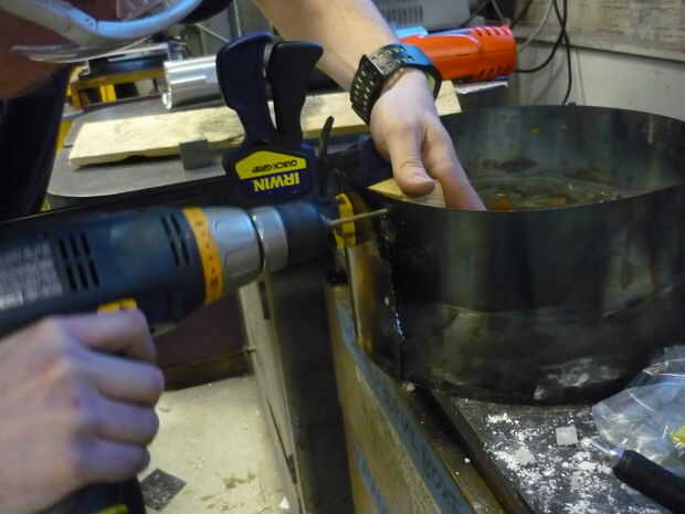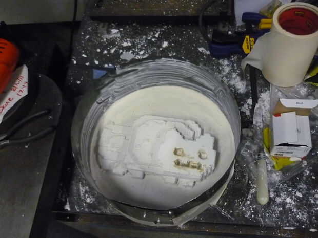 Preparar para el aluminio fundido que cubra la totalidad del molde envolviéndolo con acero del resorte y se mantiene junto con remaches de acero. Utilizar algunos más yeso en la interfase entre el resorte y el molde y alíselo para que el aluminio no vierte por los lados; similar a lo que se hizo antes con el fin de mantener el yeso para fluir hacia abajo los lados de la cacerola.