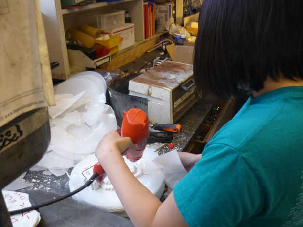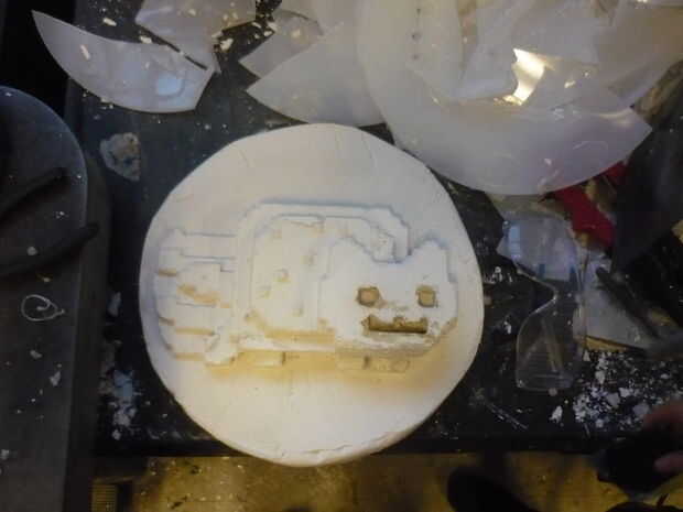 Usando un cuchillo x-acto (o equivalente), Extraiga lentamente cada capa de polietileno de baja densidad. Nota, con una heatgun [link] hace retirar el polietileno de baja densidad y mucho más fácil. Ser meticuloso y lento es mejor que cortar con rabia, como el yeso es bastante delecate. En el transcurso de dos horas, emerge un molde negativo del molde de pastel de nyan!