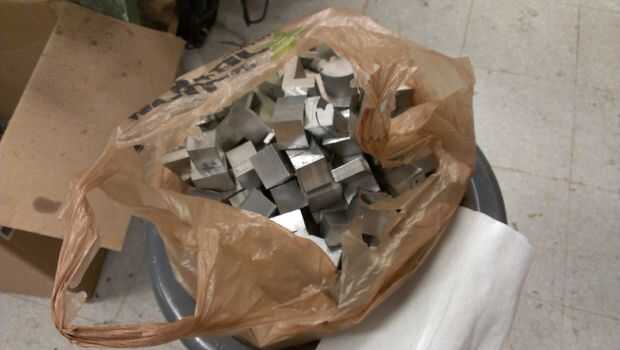 Encontrar alrededor de 10 libras de aluminio chatarra y cortar en trozos de 1.5-2" para la fusión. Fueron capaces de obtener el aluminio de desecho de una tienda por chorro de agua y utiliza una sierra/Sierra de arco para romper las partes en trozos más pequeños, área de superficie mayor.