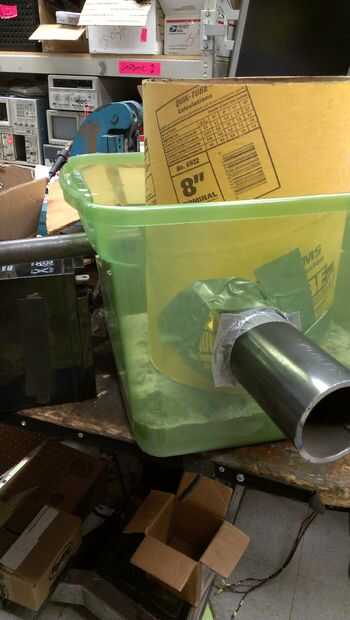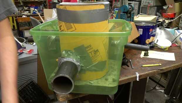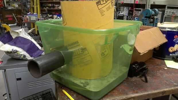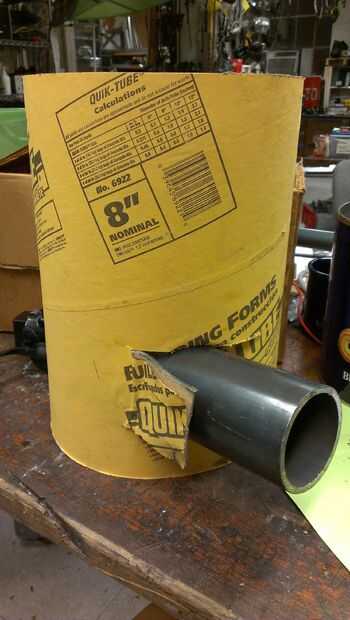 Recoger 40 libras de mezcla de hormigón quick-set, una tina grande de plástico, una longitud corta (~ 5") de tubos de acero, cinta adhesiva, un ventilador canalizado y un tubo de hormigón en su ferretería local.