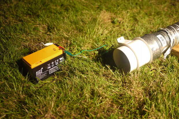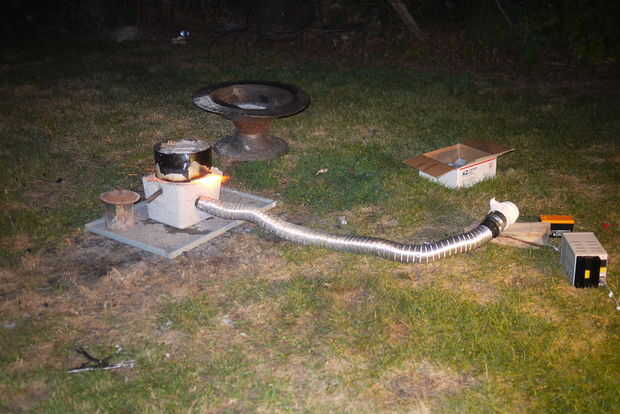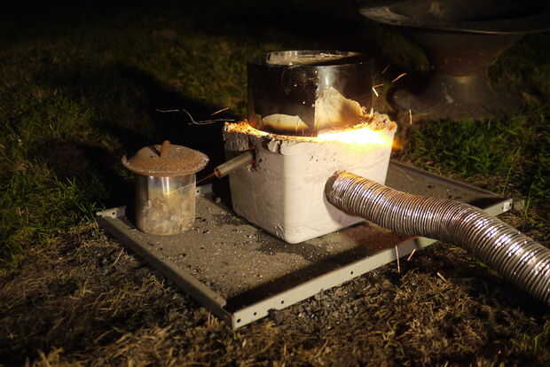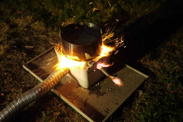 Tener el horno arriba fuera en una superficie no inflamable, idealmente una chapa de acero u hormigón entrada de auto. En nuestro caso, fue la plataforma de un montaje de estantería de acero. Nota, rociando la zona de trabajo (patio trasero) con agua ayudó a impedir que la ceniza volante causando problemas, como siempre estar consciente de su entorno de trabajo. Tiene césped circundante o zonas inflamables bien humedecidas con abundante cubos de agua. Fije el conjunto de ventilador canalizado al horno y puede conectarlo a una fuente de alimentación variable.