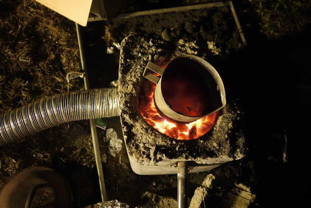 A continuación, tomar algunos de los más pequeños trozos de aluminio y ponerlas en el crisol (en nuestro caso, una jarra de leche de acero con una tapa de olla de hierro fundido) y ponerlo todo en la fragua antes de encender otra vez, esta vez a plena potencia. Se recomienda utilizar pequeños trozos de aluminio al principio debido a la mayor superficie, haciéndolo más fácil de fundirse.