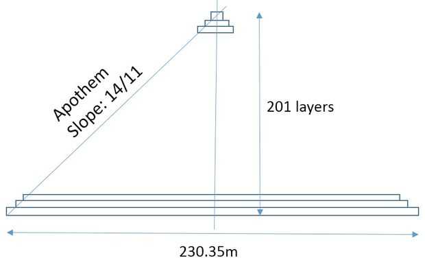 Hay 201 capas físicas entre 49,5 cm de la capa más delgado no. 173 a 150 cm la capa más gruesa n º 1. Por lo tanto presenté 201 cajas en licuadora, cada uno de ellos tiene la medida dada por el informe en una escala de 1/10000. Entonces apilar las cajas a lo largo del eje z. Las dimensiones de X Y de cada caja se colocaron tal seguir la pendiente de la apotema. (14/11 /) y la primera caja (base de la pirámide) mide m 230,35. Así, al final, obtuve un modelo que tiene el mismo número de casillas que las capas físicas de la pirámide. Para finalizar el modelo fusionaron todas las cajas (modificador de "Unión" en la licuadora) para obtener una sola cáscara estanca que pasa la barra de herramientas 3D de Blender.