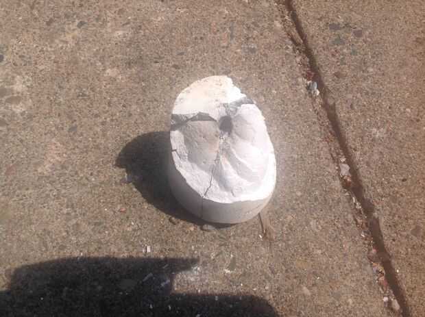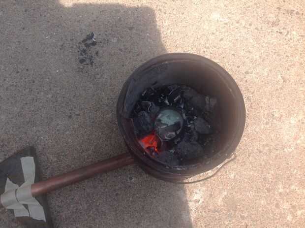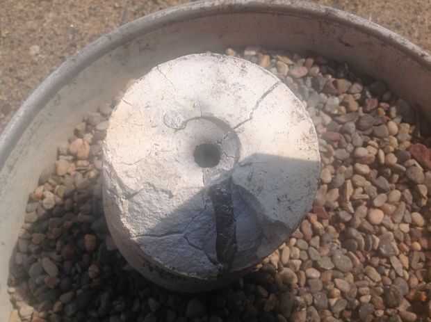Cuando el metal está bien fundido, como se ve en la primera foto, utilice pinzas largas para sacarlo del horno y luego use un destornillador para desnatar apagado la escoria en la parte superior. Con los alicates, viértala suavemente en el orificio de su molde. Mi metal comenzó a burbuja con furia cuando vierte en el molde, así que use equipo de seguridad. No sé si era el yeso de París o la cera residual, pero algo hizo un montón de gas que burbujear hacia fuera a través del metal. Finalmente, la ebullición parado y el metal frío. Permite por lo menos media hora para se enfríe - una hora es probablemente aún mejor.