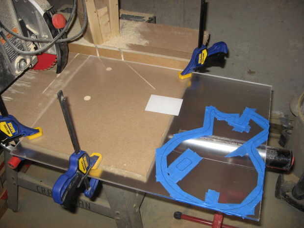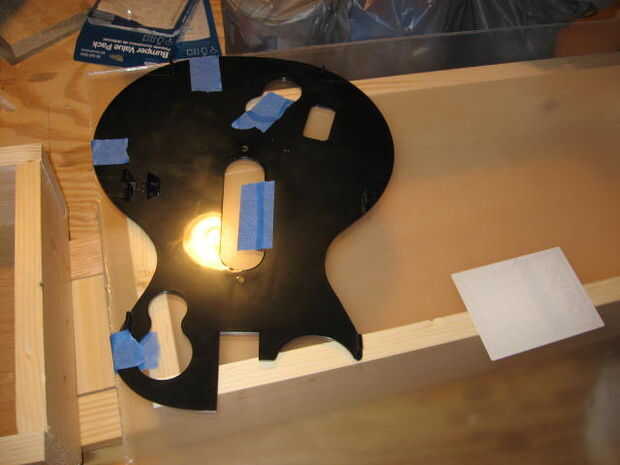 La parte frontal del cuerpo de la guitarra tenía una placa de plástico fino. Esta pegado a una hoja de plexiglás para utilizar como patrón, luego remontar alrededor de él con un rotulador. Asegúrese de que también traza el agujero para la barra de trémolo. Una vez trazado en el plexiglás, ponga cinta azul en las líneas de corte, esto le ayudará con el corte.