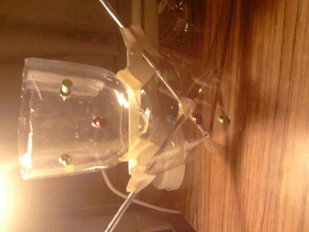 muy hilandero del viento del simple hecho de una botella de agua plástica, cinta adhesiva y una caña de bambú.Todo lo que necesitas hacer es cortar un agujero en la parte inferior de la botella, aproximadamente 1cm de diámetro (dependiendo del diámet