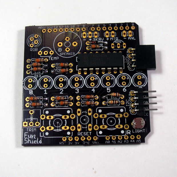 Las cabeceras de I2C en el lado derecho son opcionales y le permitirá conectar dos tablas juntas, o conectarse a otro dispositivo I2C como un Wii Nunchuk o LCD I2C de Adafruit. Son lógicamente próximos porque se sientan tan bajo, pero se pueden agregar más tarde si lo desea.