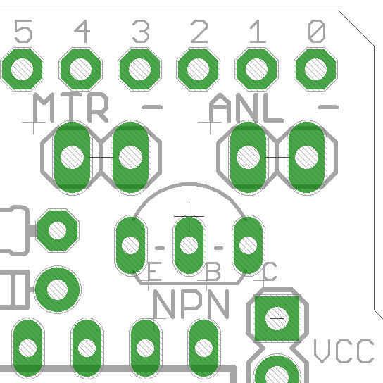 El Transistor NPN va en la parte superior derecha del tablero y puede o no tener la cara plana apuntando hacia el centro del tablero, dependiendo de su fabricación. Revise su hoja de datos y el esquema de arriba para ver donde están las clavijas de la base, colector y emisor. El transistor es un interruptor electrónico que nos permite utilizar la pequeña corriente del Arduino pueden suministrar pernos digitales para controlar un motor que necesitan 200 miliamperios. Un LED, por el contrario, sólo necesita 10 miliamperios, por lo que puede ser alimentado directamente en los pines digitales.